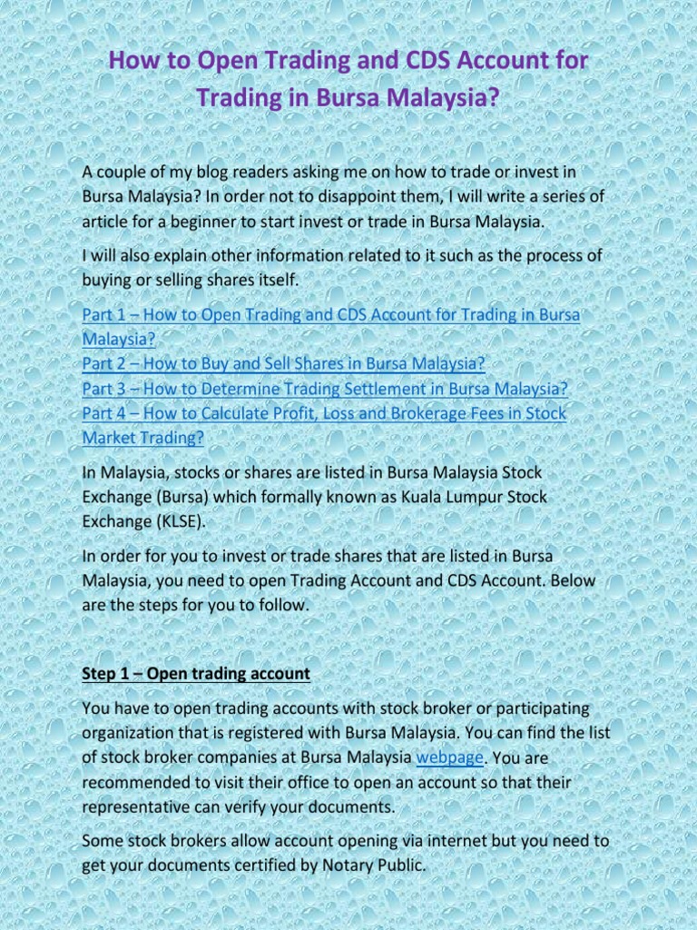 Our main branch is located at: Before you open a brokerage account with a malaysian broker, you first need to open a central depository system (cds) account. Application for reactivation of cds account. It takes me less than 15 minutes to register for a share trading account. Open an account with us today. So bursa malaysia has my applause for this. In order not to disappoint them, i will write a series of article for a beginner to start invest or trade in bursa malaysia. Education in kuala lumpur, malaysia. In order to open a cds account, you need to approach an authorized depository agent such as stockbroking company, and provide a copy of your identity a list of licensed stockbroking companies can be found on the bursa malaysia or securities commission malaysia website. Visit our investor centre to open your trading account. Fastest online stocks trading in malaysia the fastest and easiest method to start invest online in malaysia is via opening a cds + stocks. Sometimes, it may be tedious for foreigners to. Yes, a minimum cash deposit of rm1,000 (ringgit malaysia one thousand) is required to start trading.